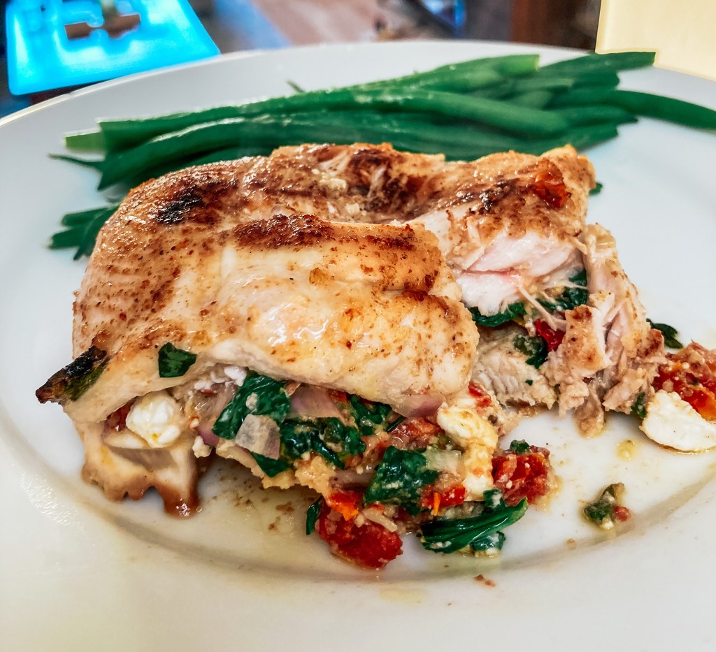 spinach feta filling. Mix well and set aside. - Divide spinach mixture between the chicken breasts and stuff into each, about 3/4 cup each. If needed, you can use toothpicks to close chicken breast.