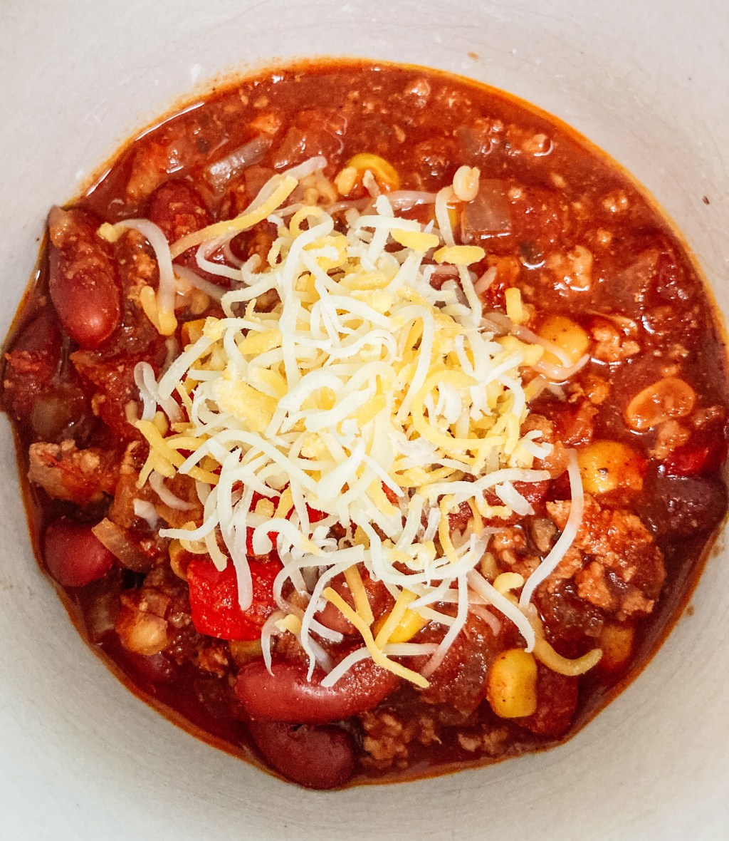 Next add in tomatoes, chicken broth, kidney beans and corn. Bring to a boil, then reduce heat and simmer for 30-45 minutes or until chili thickens and flavors come together. Taste and adjust seasonings and salt as necessary.