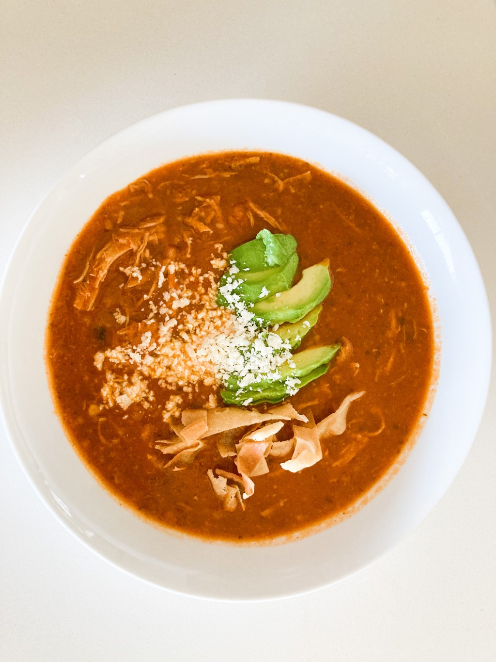 To serve, put the remaining tortilla strips in bowls, top with the cheese and avocado