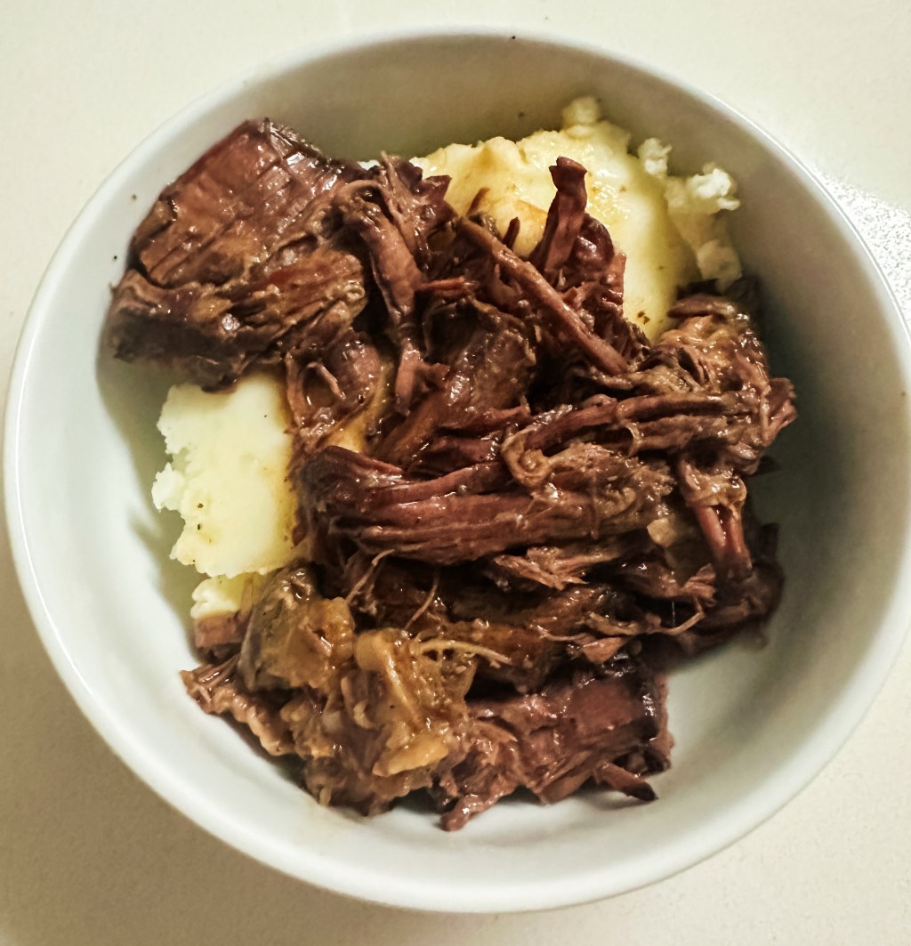 6.) Slow cook 8-9 hours on low or ~6 hours on high (roast should fall apart when shredded)